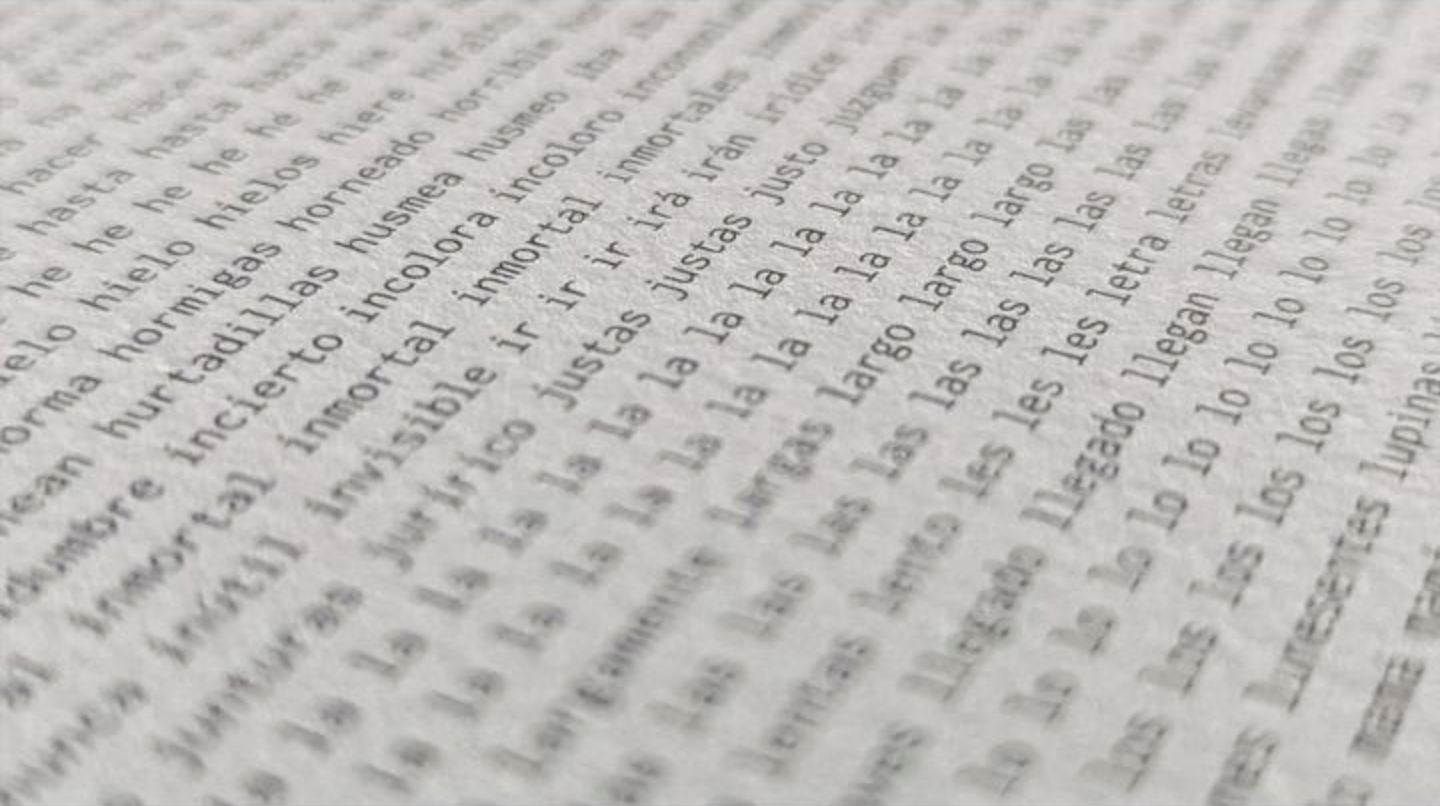 Esta pieza resulta de una serie de exploraciones sobre el sentido en relación al lenguaje, más precisamente al lenguaje poético. Tomamos las palabras como materialidad impresa sobre una superficie, y a la lógica de lo poético como la creación de relaciones entre palabras en función de conceptos, normas, imaginarios, etc. Lo más importante ha sido reconocer que no hay límites (o por lo menos no los conocemos) cuando se refiere a producir relaciones poéticas y de este hecho emerge (casi) todo lo que puede ser dicho.