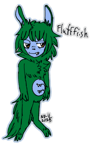 Green Fluffish — But anyways, here's a green Fluffish I originally doodled in a small notepad (I had to edit out the lines from the line paper.) then I scanned it with my mom's scanner, then I darkend the lineart, then colored it, muliplied the coloring then put Art-shield over the drawing. (It added a black background, since it is a transparent png, so I just cut out the black background with the want tool) (These things are inspired by Labubus, I do want to still make them more fishy...