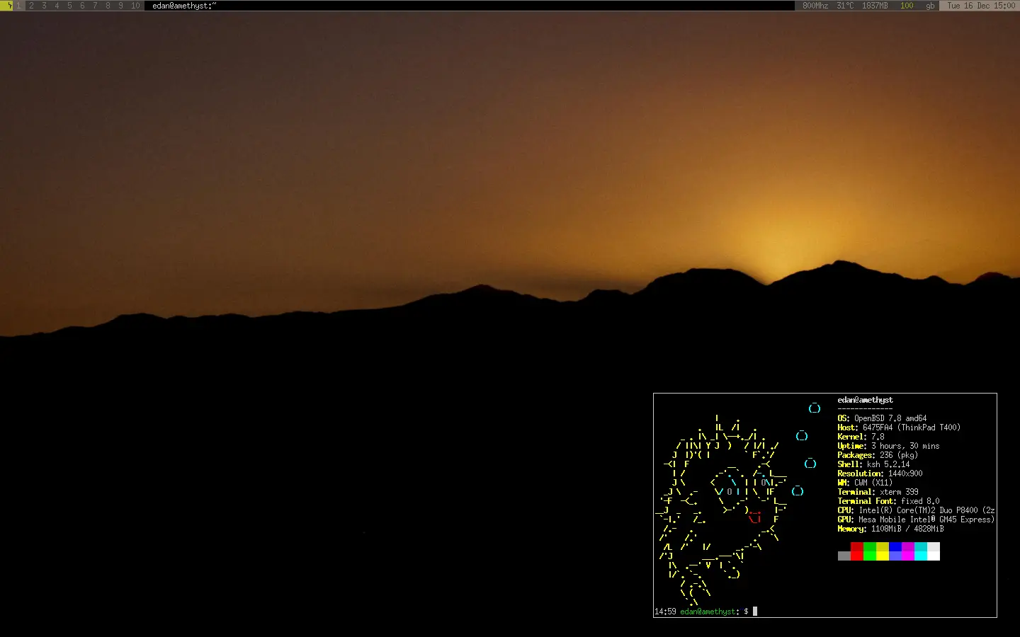 The cool think is that I've installed OpenBSD in my "new" Thinkpad x1 carbon gen9, with the same packages and tools, just copied the configuration and rsync'ed my $HOME and it works almost flawlessly.