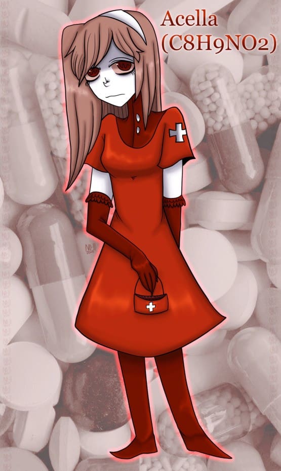 Acella (C8H9NO2) — A chemical gal I drew that's based off of Acetaminophen, the stuff in general pain medicine, like Tylenol and generic pain medicines. (I've basically been making these chemical women since 2015 iirc.) ---- I'm still a little unhappy that the US gov is going after tylenol and stuff, seriously believing it causes Autism, that's still pretty absurd to me altogether. This has been sitting in my drafts for a few weeks and I might as well post it.
