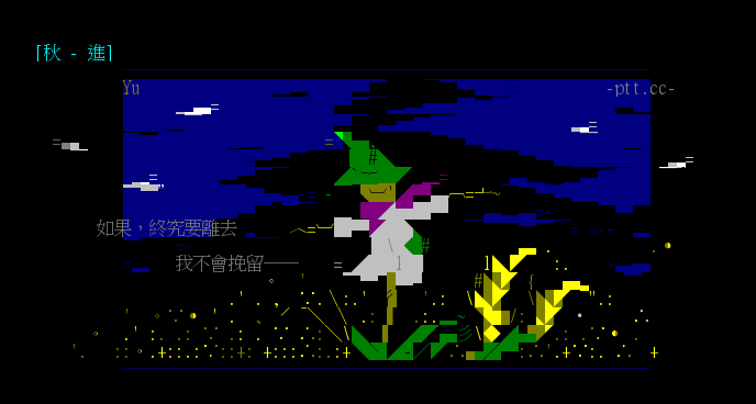 I've recently been sucked into the world of Taiwan BBS ANSI art. This is a largely independent scene from its western counterpart, and grew out of BBS servers that are still used today in Taiwan (search "PTT Bulletin Board"). There are very few english resources on the subject so I've been leaning heavily on translation tools. The language barrier is rough though.