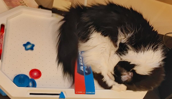 Kitty on her favorite bed — She has a perfectly good cat bed. But she has chosen the air hockey table as the preferred sleeping spot.