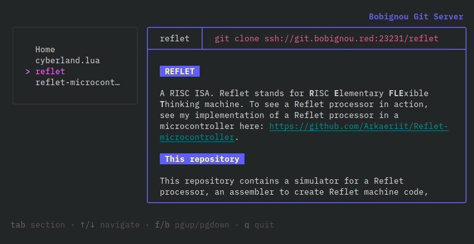 To browse the repositories on Soft Serve, the TUI is very convenient. By typing `ssh -p 23231 git.bobignou.red` I can easily see all the repository I pushed and their `README.md`. The command used to clone the repository is written in the right box which is really neat.