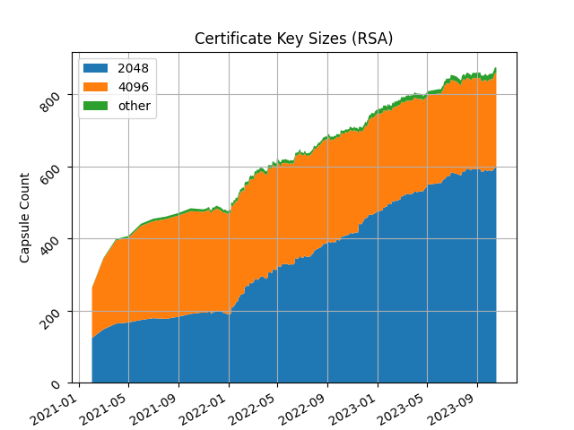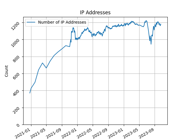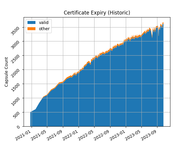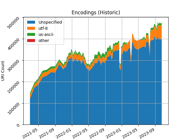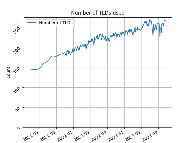 With Stéphane Bortzmeyer's kind permission, I wrote a script to download and parse his statistics page daily and generate charts from the data.