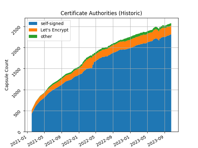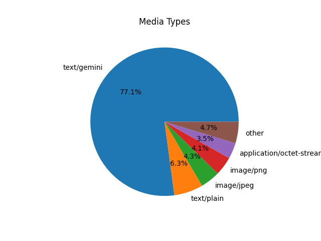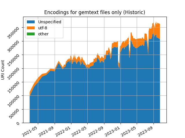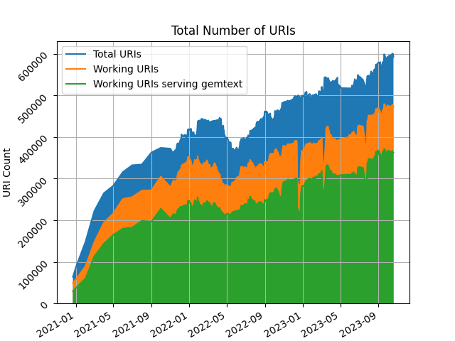 My script first downloads and parses the gemtext of the statistics page and then saves the data to a SQLite database. Charts are generated from the data stored here. This database has been seeded with data from Stéphane's archive which keeps the statistics for the first day of every month. You can download it here and use it for your own projects: