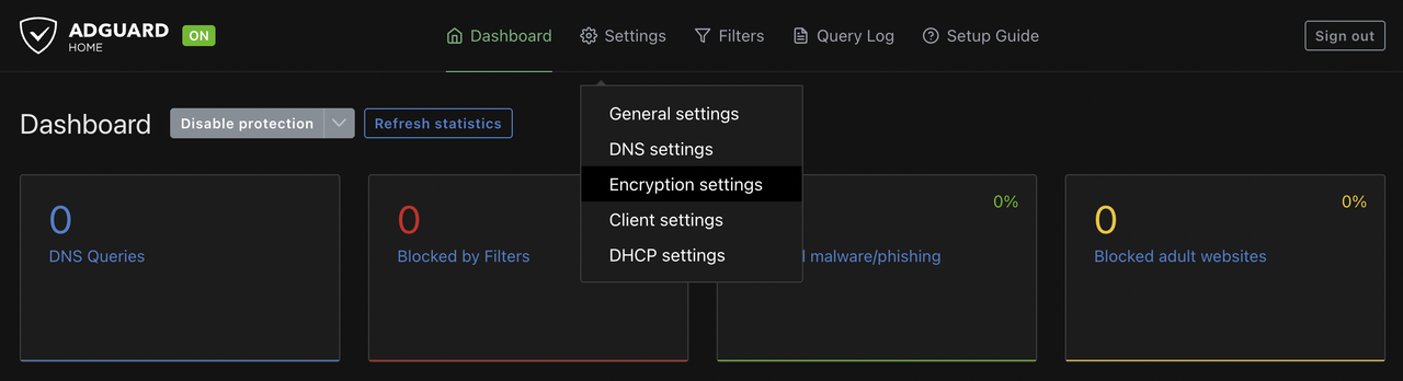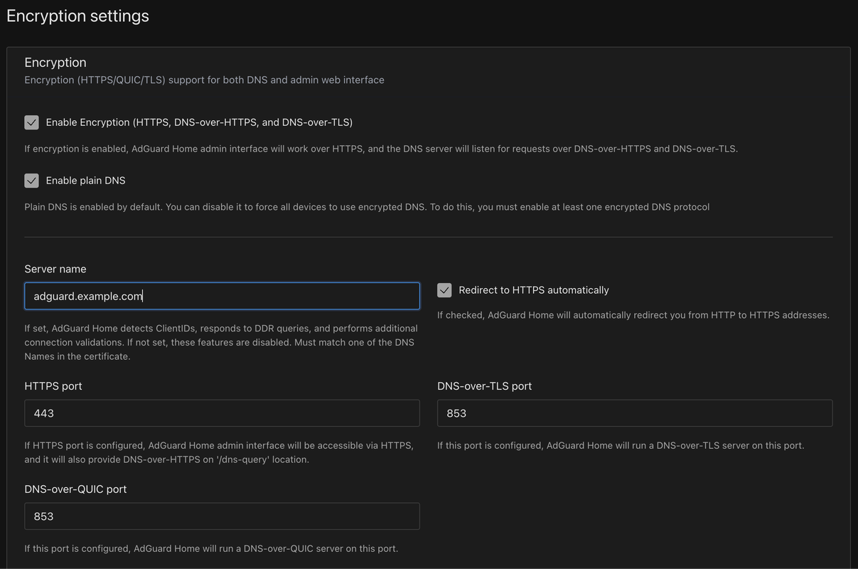 Нажмите сохранить, чтобы применить настройки шифрования. После включения шифрования, доступ к AdGuard Home с помощью `https://adguard.example.com`.