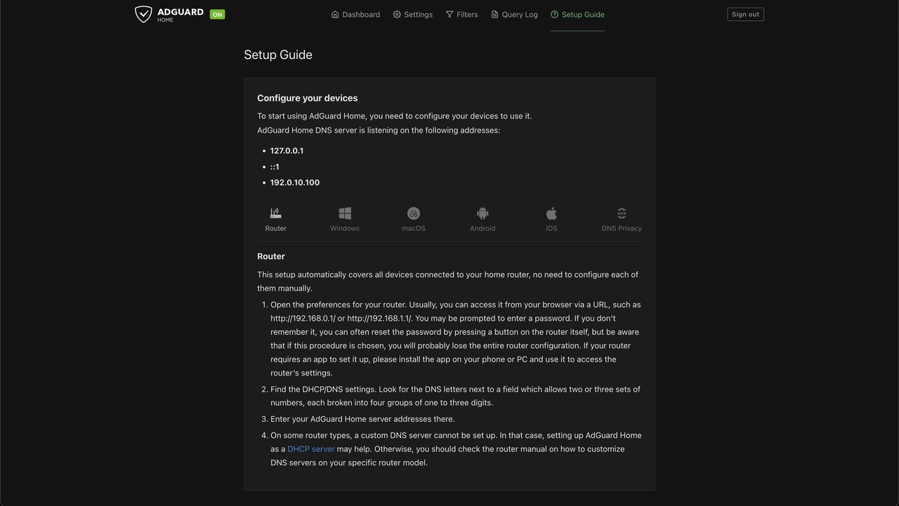 Вы можете найти настройки конфигурации для большинства типов устройств из опции «Руководство по настройке» в верхнем меню навигации панели инструментов AdGuard Home.