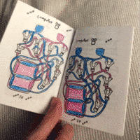 photo of a pair of colored pages of the zine, with a 7 segment display showing the digits 2 and 3
