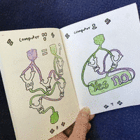photo of a pair of colored pages of the zine, showing a digital circuit answering if two colors are the same