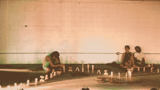 photo of the rite of computing: there is a wiggly row of shapes in the floor, each of them composed of small blocks of wood. a person is crouching, building one of these shapes. other two people are watching, sitting in the floor. there are some cardboard shapes with symbols, also in the floor.