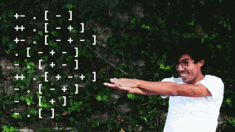 photo of a smiling person who seems to be dancing, with extended arms in front of them. they are pointing towards the left, where there's an overlay of some kind of code written with addition and subtraction signs, periods, and square brackets.