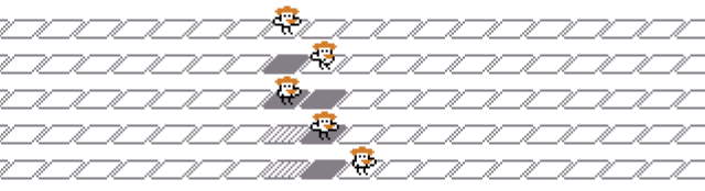 four rows of tiles, each one with a different pattern of tiles and with a bird with a hat in a different pose and position