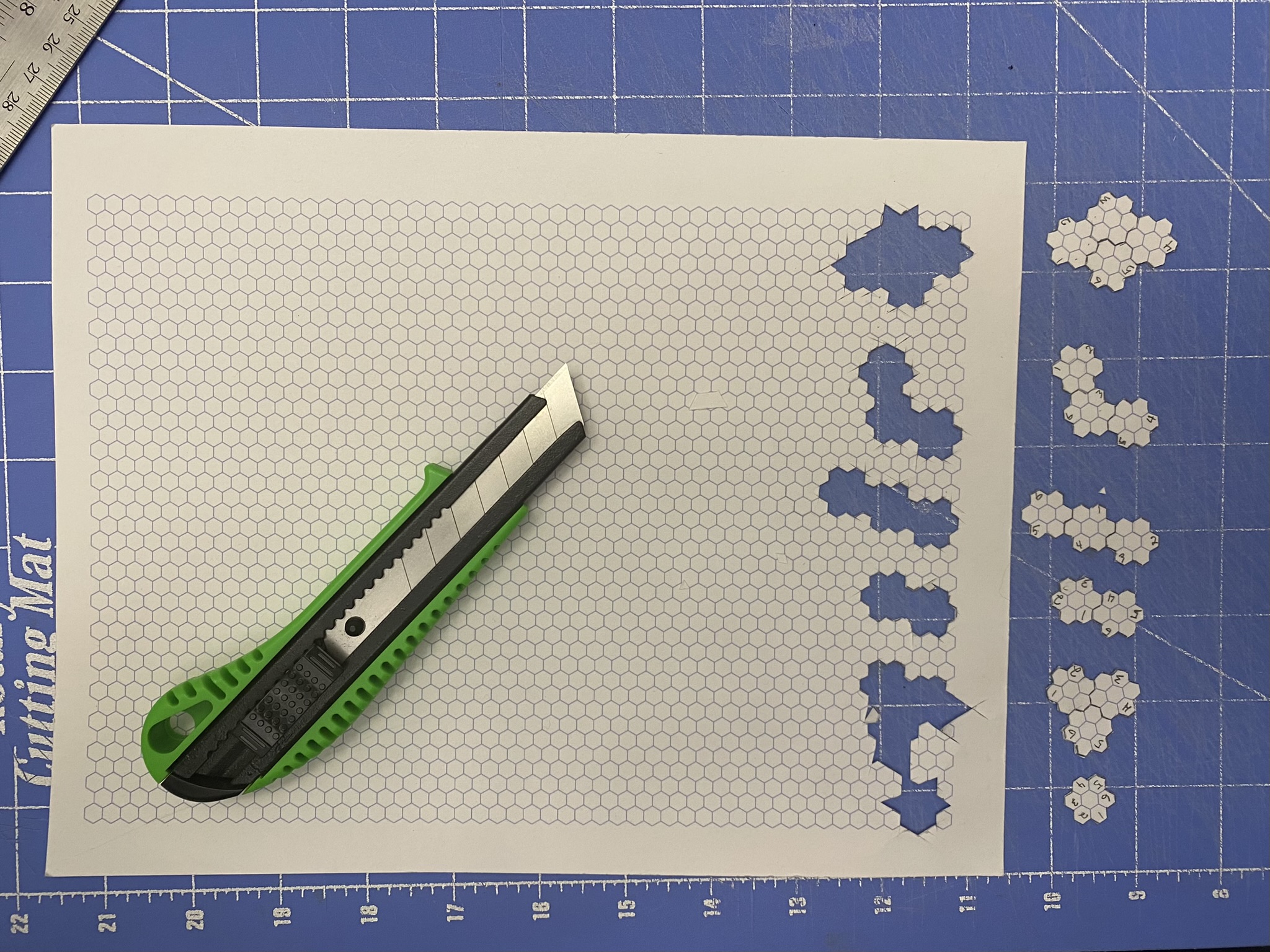 Now, I must be hexagonally challenged, because drawing the six basic megahex from the box bottom shapes is very difficult for me, making me very slow at drawing. So I printed out some more hex paper, on card stock this time, drew out the shapes, and proceeded to cut them out to use as patterns when drawing. It will be interesting to see how that works for tracing the outlines.