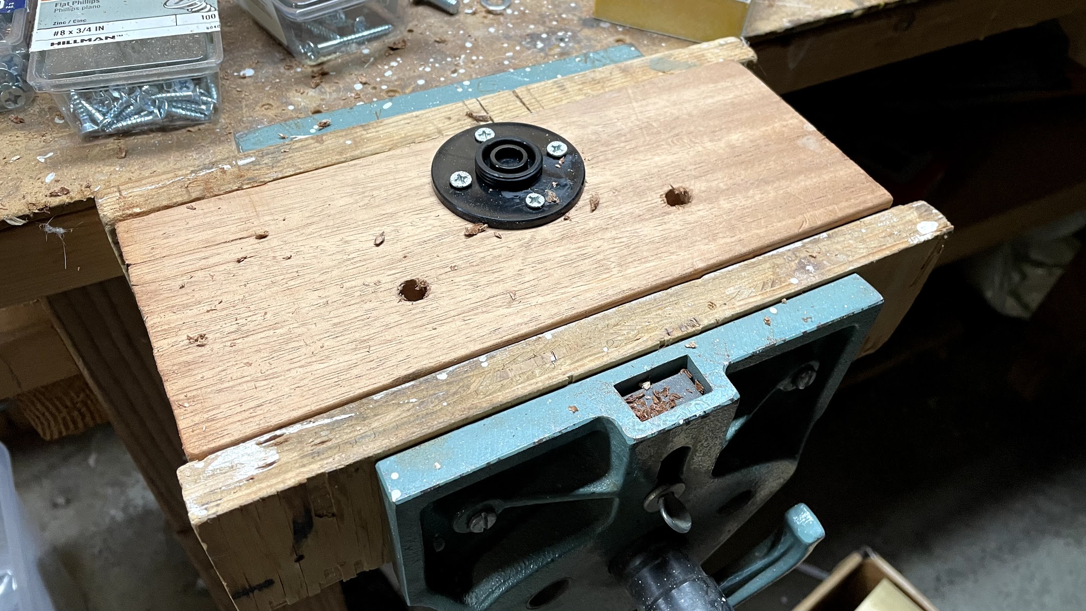 Luckily, I had a nice piece of scrap wood exactly the right size down in the basement. First, I attached the base of the camera mount to the scrap wood, and drilled some holes: