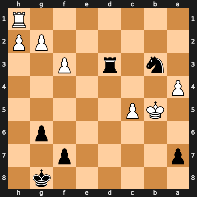 Con todo esto, el FEN anterior corresponde a este tablero (hemos orientado el tablero invertido para representar que les toca mover a las negras):