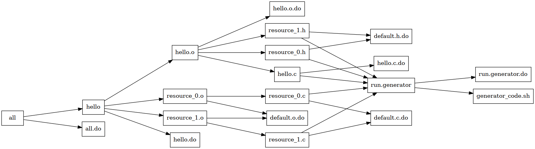 It should be easy to see, that all the generated resource files are going to be needed. Please note, that in order to build hello.o from hello.c all resource_#.h files must be generated at this point. This requires a separate hello.o.do file including some magic to record these dependencies: