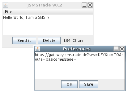 - *JSMSTrade** is a lightweight Java Swing desktop application that provides a simple graphical interface for sending SMS messages through the smstrade.de gateway service. The tool is designed to be a quick-access panel that allows users to compose and send text messages up to 160 characters directly from their desktop, with real-time character counting and validation. Users configure their smstrade.de API credentials (including API key and recipient number) through a preferences menu, and the application constructs HTTP requests to the gateway service to deliver messages.