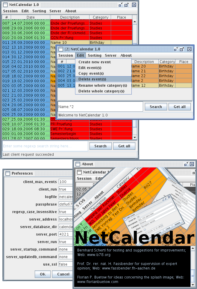 NetCalendar is a Java-based distributed calendar application that can run as either a standalone application or in a client-server configuration over TCP/IP. Built with JRE 6+ compatibility, it's distributed as a single JAR file that can operate in three modes: combined client-server (both running as threads in one process), server-only, or client-only. The application features optional SSL/TLS support for secure communication between distributed components and includes a GUI client for managing events and preferences.