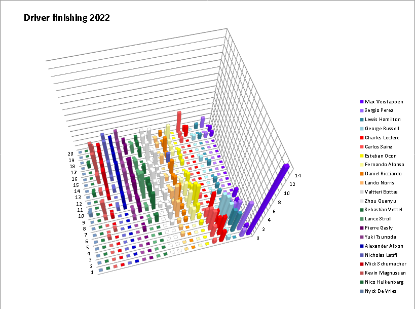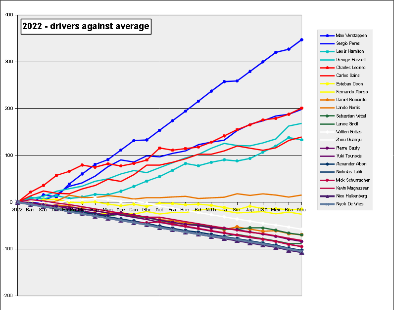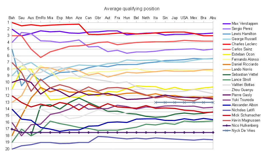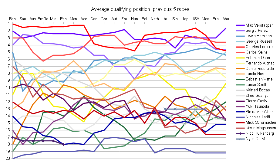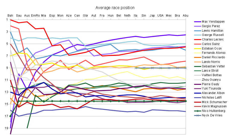3.62 Max Verstappen 5.00 George Russell 5.48 Lewis Hamilton 5.52 Sergio Perez 5.67 Charles Leclerc 8.05 Carlos Sainz 8.90 Lando Norris 8.95 Esteban Ocon 9.00 Nyck De Vries (only 1 race - gets seat for next year) 10.43 Fernando Alonso 11.53 Sebastian Vettel (retired) 11.95 Valtteri Bottas 12.24 Lance Stroll 12.38 Pierre Gasly 12.67 Daniel Ricciardo (dropped) 13.95 Alexander Albon 14.00 Kevin Magnussen 14.33 Mick Schumacher (dropped) 14.43 Zhou Guanyu 14.50 Nico Hulkenberg (only 2 races - gets seat for next year) 14.76 Yuki Tsunoda 16.10 Nicholas Latifi (dropped)