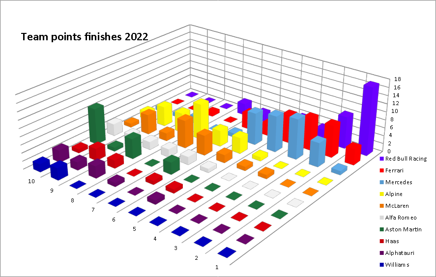 This shows how points are skewed towards the first few positions. Russell and Hamilton are doing well here because they are consistent, but Leclerc is beating them on points because he has wins.