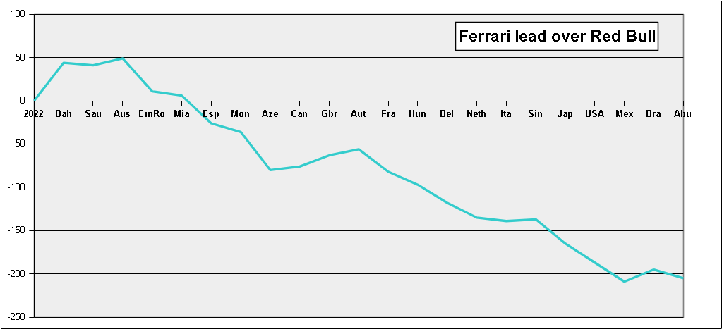 The "average team" scores 10.2 points (with some variation because of sprint races, half points races, and fastest lap not necessarily getting a point). Below average teams are on a downward slope.