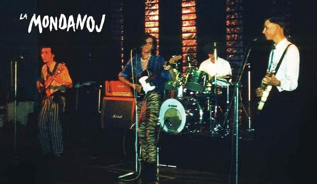 La Mondanoj was one of the early Esperanto rock groups, active between 1983 and 1987 and based in Berlin. They had a strong reputation as a live act at Esperanto events and in the local Berlin scene, but produced relatively little in the way of recorded output: their officially published work consists solely of the studio recording of one song, Muskola Belulino, which appeared on Vinilkosmo’s 1995 Kompil’ Vol. 1. The band also produced a number of demo tapes, which were distributed in small quantities, and there was at least one bootleg live recording of the group. The difficulty in obtaining copies of their music has given the band something of a mythical status, and much of the information available about them to date has been incomplete and/or inaccurate. Thanks to significant contributions from the band members, I hope to be able to clarify their history in this post.