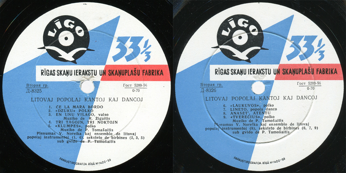 The record was released in December 1961 by the Latvian state label Līgo and was repressed in 1964 by Melodija - the same firm, albeit renamed in the interim to use a transliterated version of the same brand as its parent company, the USSR’s main state label Мелодия. These two editions both had Esperanto labels, and the record was also released by Мелодия with Russian labels and by the USSR’s export label Mezhdunarodnaya Kniga with English labels. In both cases, the song titles are given in the same language as the rest of the label, with a note “sung in Esperanto” underneath. None of the editions of this album had a picture sleeve - all were released in the label’s generic paper sleeves, and so they are illustrated here using the labels rather than the covers.