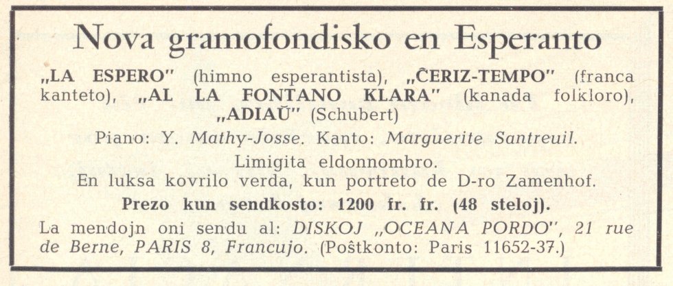 While it’s likely that Marguerite Santreuil made other recordings in Esperanto, and certainly gave many other concerts in the language, I haven’t been able to find any further details of them. Nonetheless, it seems safe to say that she was active as an Esperanto singer from at least the late 1940s until the late 1950s.