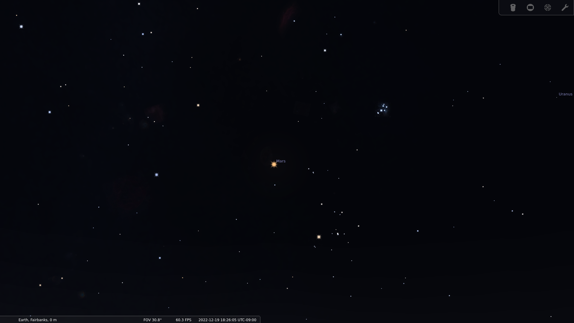 Red Mars was brilliant tonight, and also I had a crisp view of six stars of the Pleiades. I tried to adjust the Stellarium settings as much as I could to match my naked-eye view: