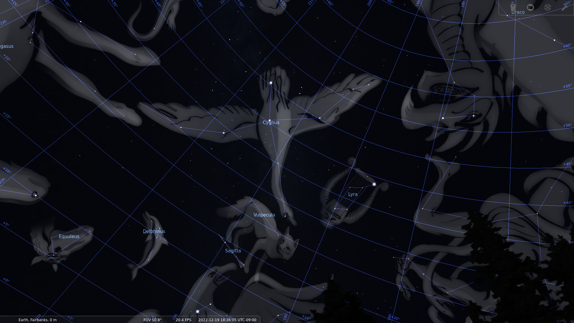 Cygnus was beautiful as ever. Stellarium doesn't capture well the brightness of the stars that wreath the tail and wings of Cygnus. This looks a little better, if I adjust the Relative Scale setting: