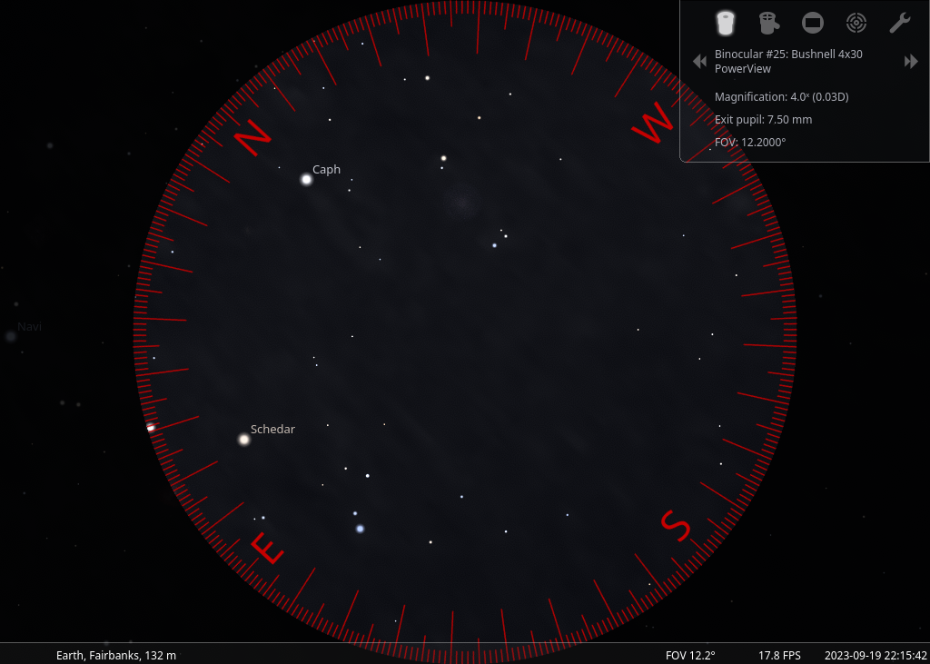 Here are some more Stellarium screenshots, where I've configured it to try to match the view in my Bushnell binocs. For interesting and beatiful viewing, it was helpful to start at the body of Cygnus, move down the neck, then jump over to Delphinus and Aquila, and also to do a slow pan from the head of Cygnus over to Lyra.