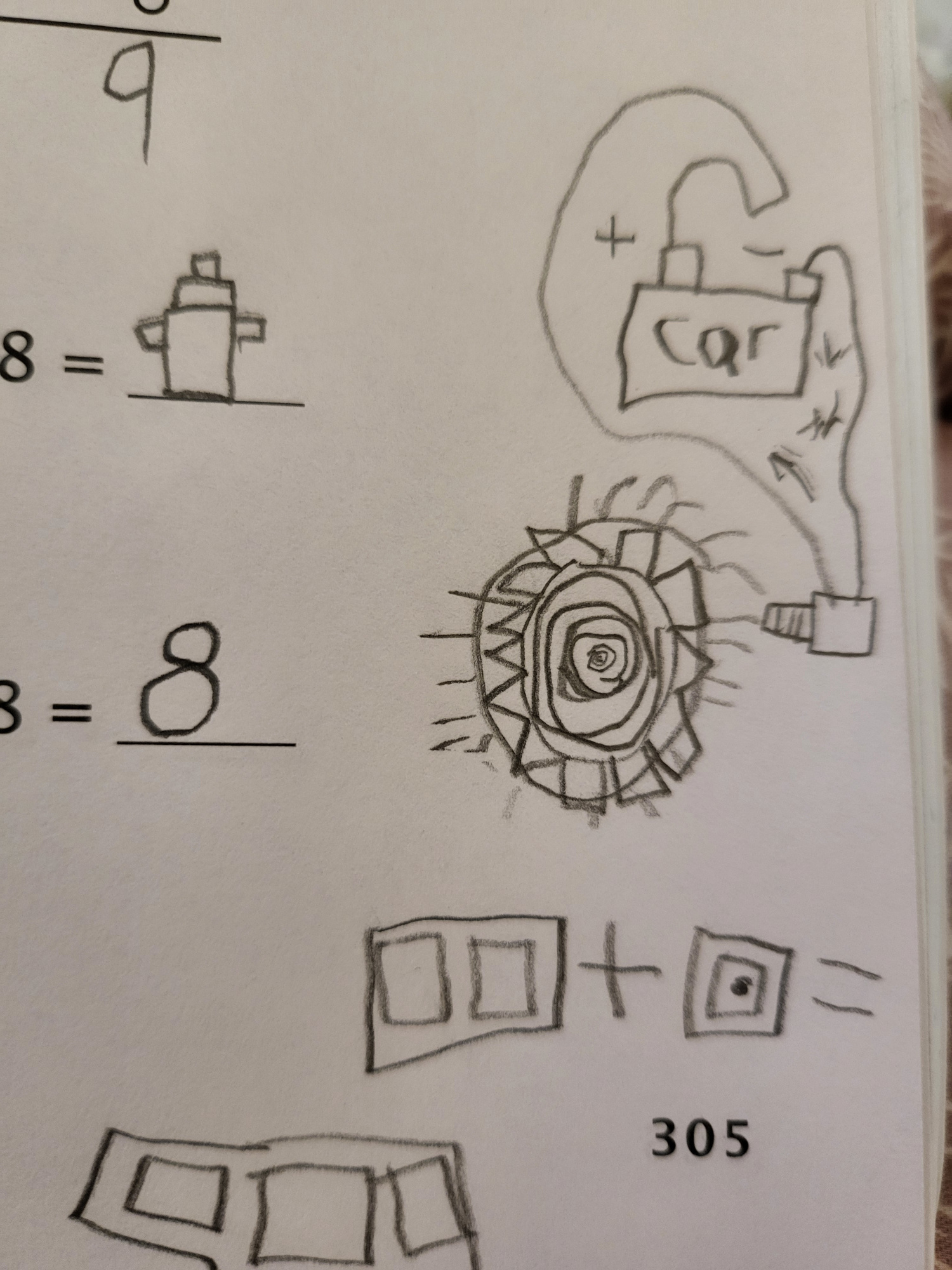 Two weeks ago, my six-year-old Silas was working on his math homework. On one problem, instead of writing the answer, he drew this diagram: