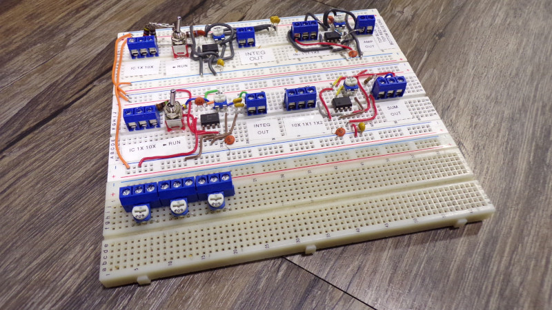 I have two integrators, one inverter, and one adder, though I haven't had time to test the adder yet. There are a few potentiometers on the bottom which will be used for coefficients, at least until I am able to mount some larger and better-quality potentiometers.