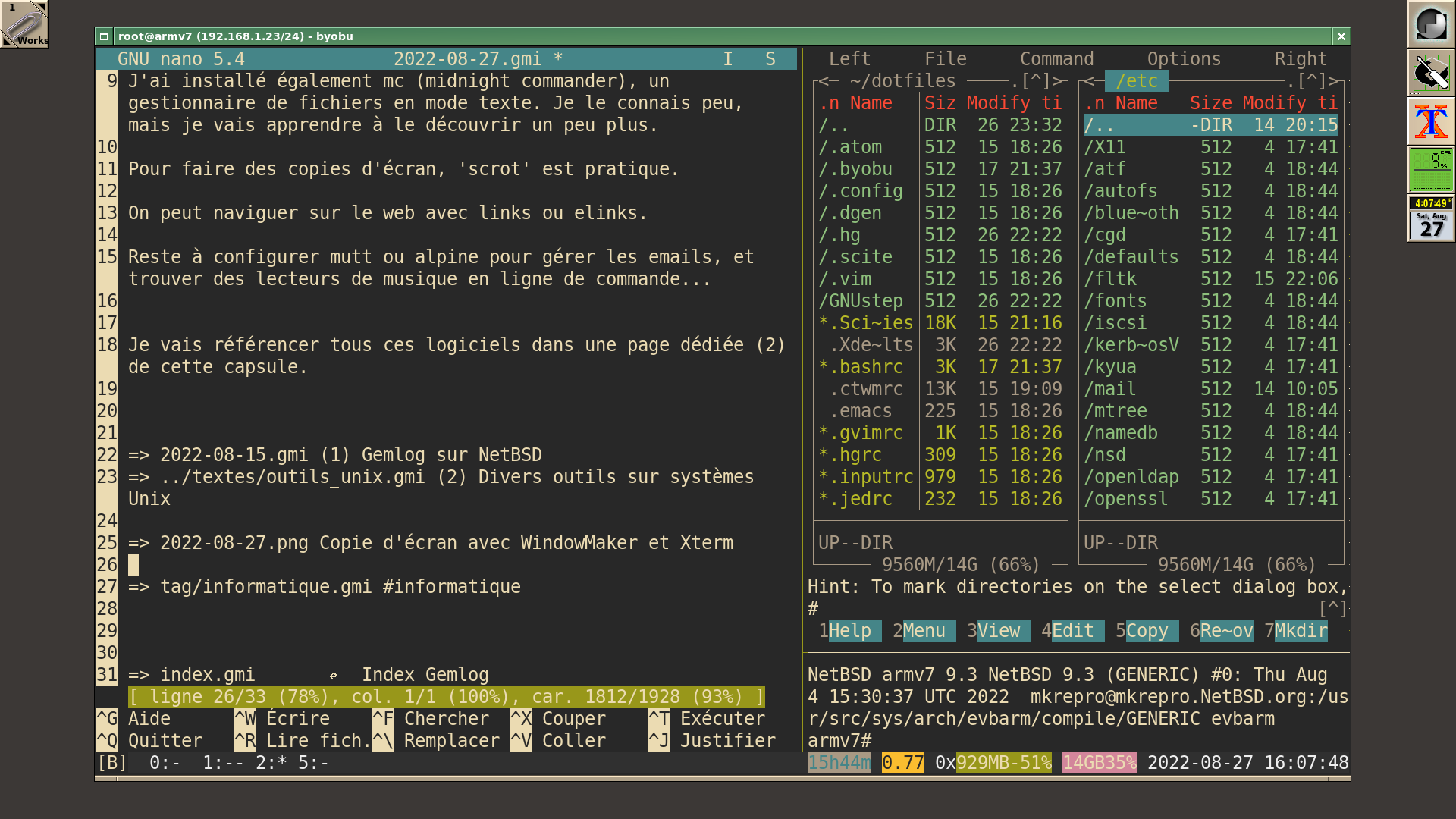 J'ai installé également mc (midnight commander), un gestionnaire de fichiers en mode texte. Je le connais peu, mais je vais apprendre à le découvrir un peu plus.