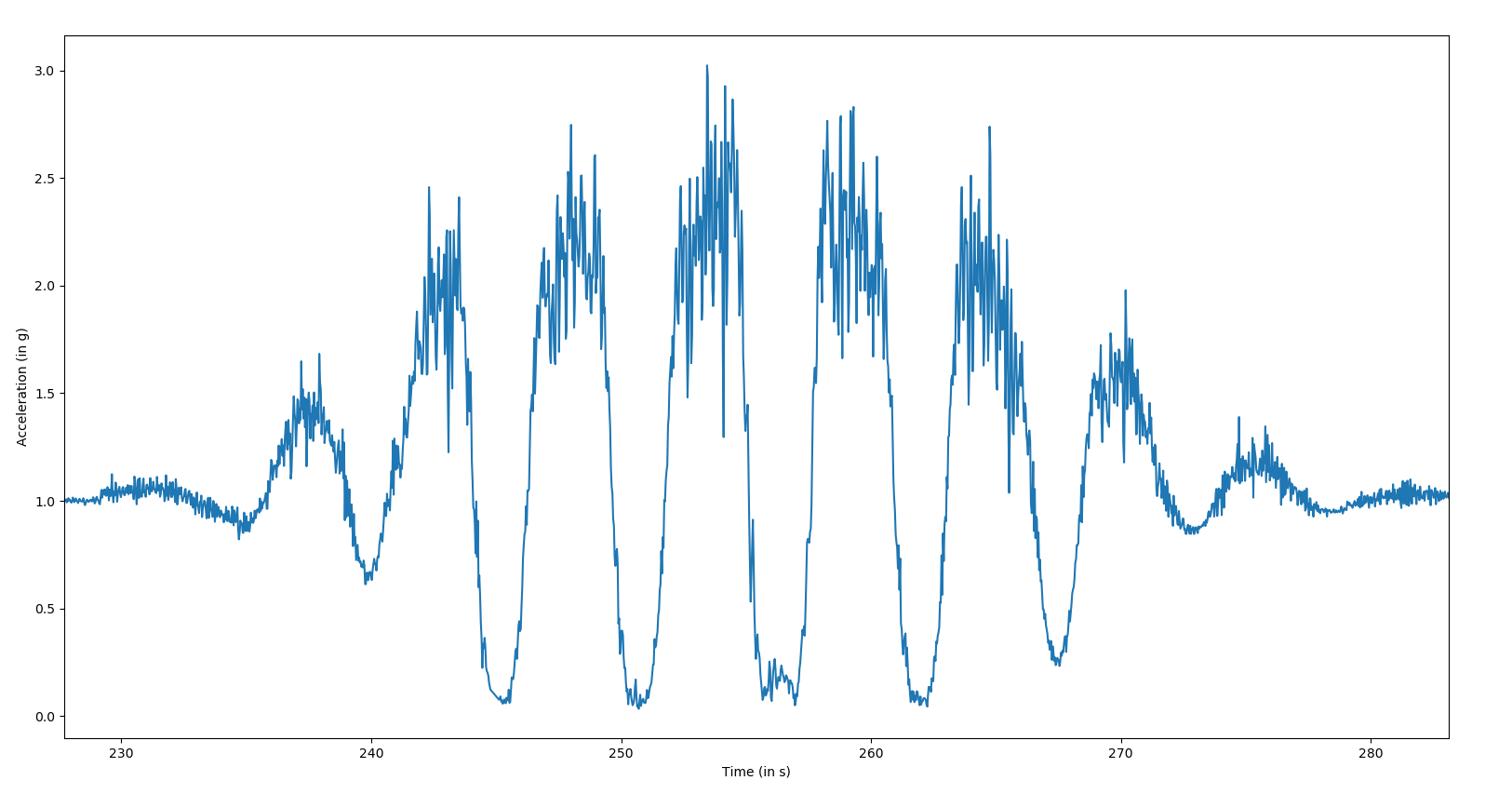 We can clearly see the moment of minimum acceleration, when the car is on top of the track, about to fall down. We can also see the moments when the car is horizontal, at the bottom of the track when the acceleration is maximal. When first looking at the data, I did not expect to see such a smooth and sine-looking graph.