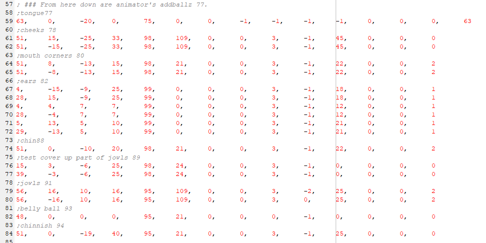 As the comments tell us, numbers 77 onward are "animator's addballz" and what they are and what order you see them in will depend on your species and breed. In general cats will have nose and ear addballz and dogs will have tongue, cheeks, mouth corners, and ear addballz. These are then followed on by breed-specific addballz such as the Alley's fangs or the Bulldog's jowls. Fortunately the progammers were good at leaving comments to say what the ballz are. Here's the Dashschund's animator's addballz: