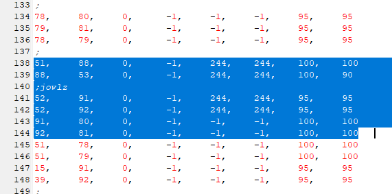 This is a large section but you probably won't need to do much apart from remove any variations (the dachshund has some colour variations you can safely remove, just make sure to leave one set or you'll end up with a disjointed tail and legs). However if you removed any addballz earlier, pay careful attention to this part of the file. Earlier we removed all of the addballz with a number higher than 81, and some of those ballz had lines connecting them elsewhere. To avoid any graphical glitches when we dress up or breed the pet, or edit in more addballz later, we need to go through and find any lines that start or end with ball numbers higher than 81, for example the highlighted: