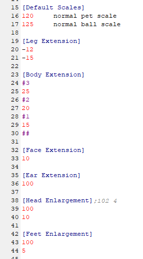 Next up comes the default scales and extensions, that control the rough size and shape of the pet. These might be different depending on your file, but you'll probably have something like this: