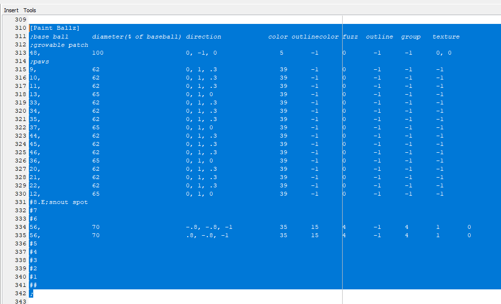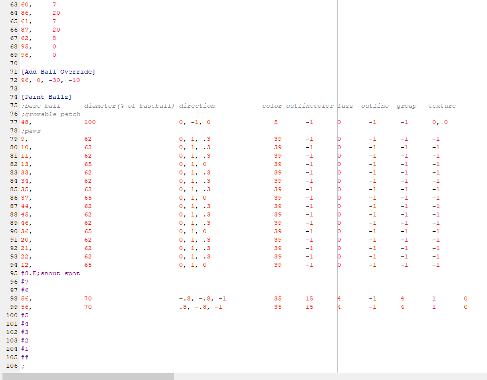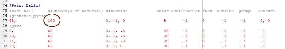 You can see that the paint ball I've created is at the top of the list, under the comment ";growable patch". Find whatever paintball you want to change, and look for the second column. This is the diameter of the paintball.
