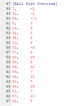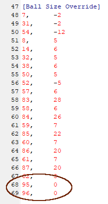 You can read the LNZ Pro helpfiles to get an understanding of what this section does, but it's very simple - the first column is the ball number, and the second is the size. We've already given the ball a size in the adult's addballz section, but this will override that figure in the baby, hence the name. So put in the number for each ball in the feature (here 95 and 96), followed by 0.