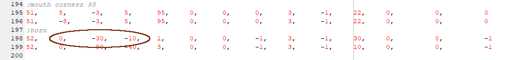 The next three numbers are the x, y, and z co-ordinates to move the ball to. We're going to use the co-ordinates of the horn base, which we can find in the adult lnz file's addball section. Rememember that the co-ordinates in the addball section are the second, third, and fourth columns. Here's the horn base co-ordinates: