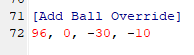 Add Ball Override takes four numbers. The first is the number of the ball whose position we want to adjust, here it's 96: