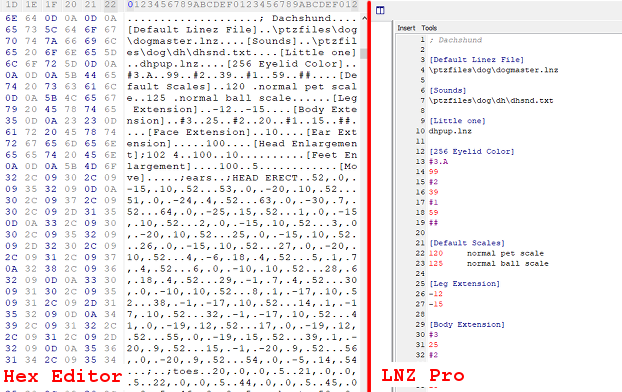 For now, let's take a look at what a LNZ file really is, and what's the deal with all those headers and numbers. A LNZ file is essentially just a text file that the game refers to so it can know what the pet should look like.