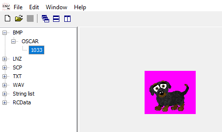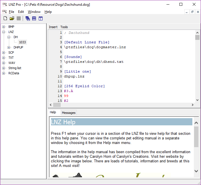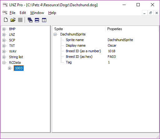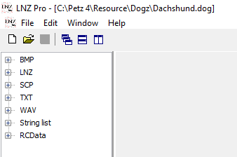 The part of the file you normally hex with, the LNZ ("linez") file, is only part of the whole. A .cat or .dog breedfile is a collection of several files (it's actually a .dll in disguse) including images, sounds, and behaviours. LNZ Pro lets us see these as individual parts. Here's what you see when you open up a breedfile. I'm using the Dachshund.