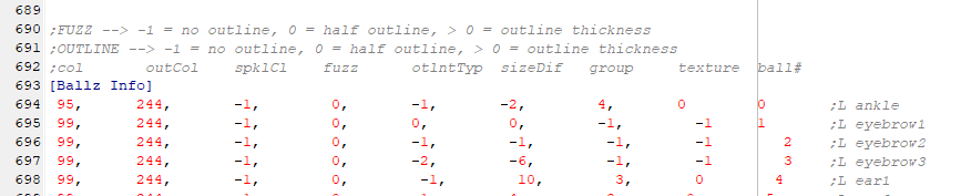 You can see that some lines are in grey - these are comments. The game will ignore anything in a comment; it's just for us to read. Comments are handy for notes to ourselves so we can remember what we were doing, and the original game programmers did the same. For example, the top of the Ballz Info section includes comments that state what each column does, as well as comments at the end of each line to state what ball it is. The programmers would have used these as reference so they weren't just looking at a list of numbers, and now it's useful for us.