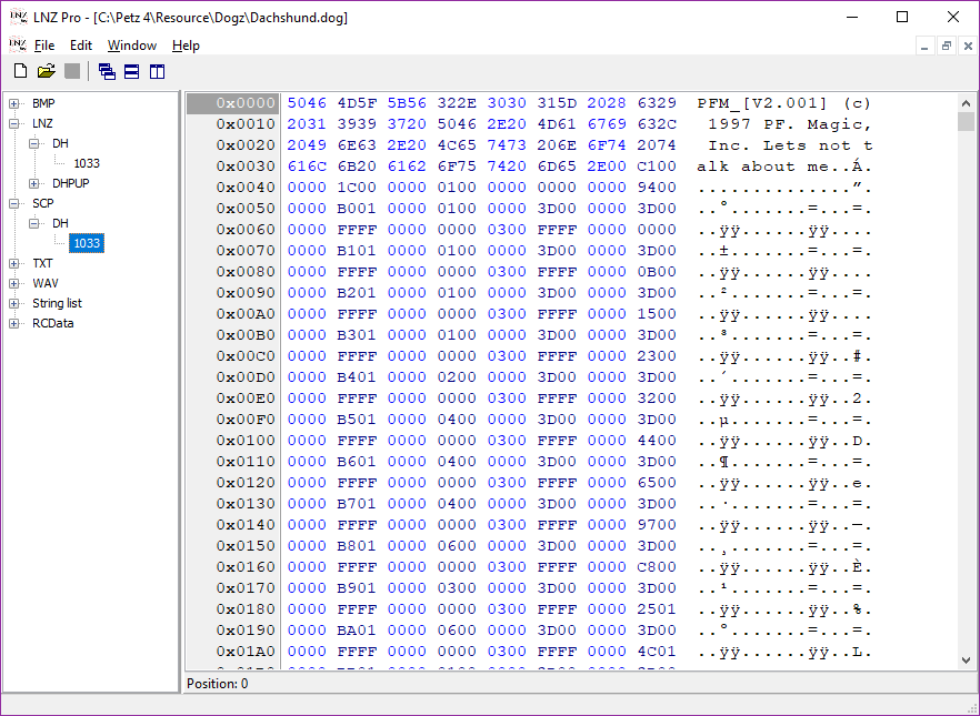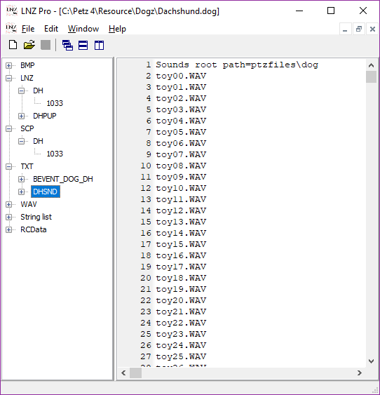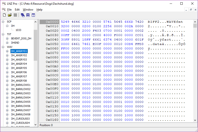 These are the unique sound files for each breed - barks, growls, meows etc. Like the SCP files they open in LNZ Pro like a hex editor, but they can be exported and edited with a sound editor if you should wish to do so, so you have a little more flexibility there. Again I won't go into how to do that; this tutorial is just about showing you what and where everything is.