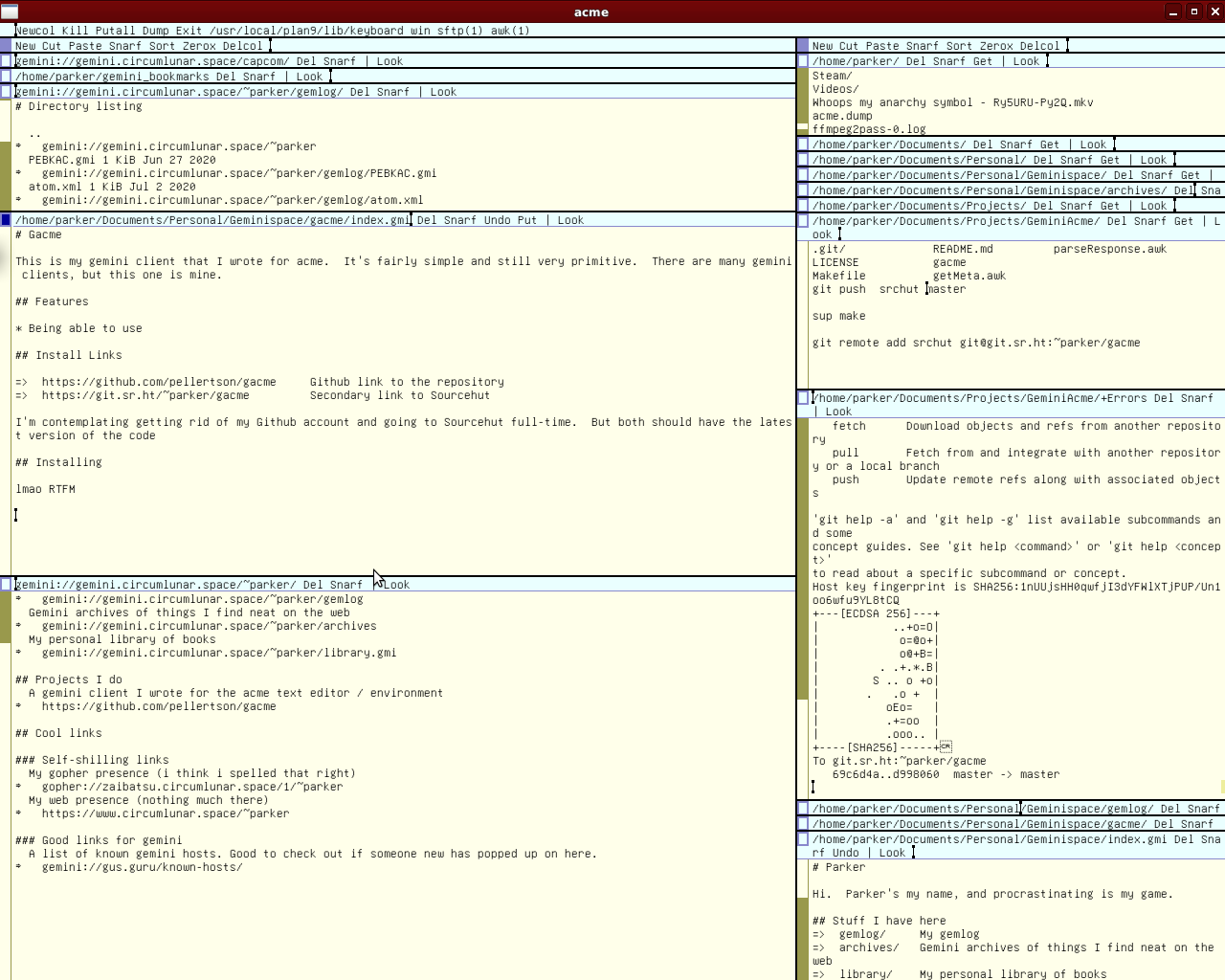 This is my gemini client that I wrote for the plan9port version of acme. It's fairly simple and still very primitive. There are many gemini clients, but this one is mine.