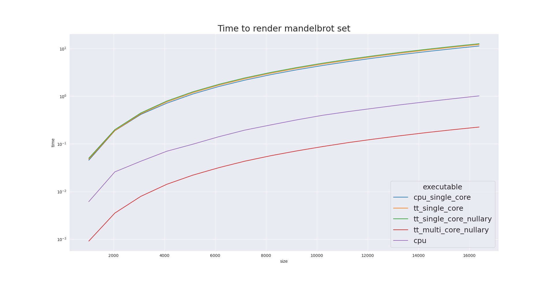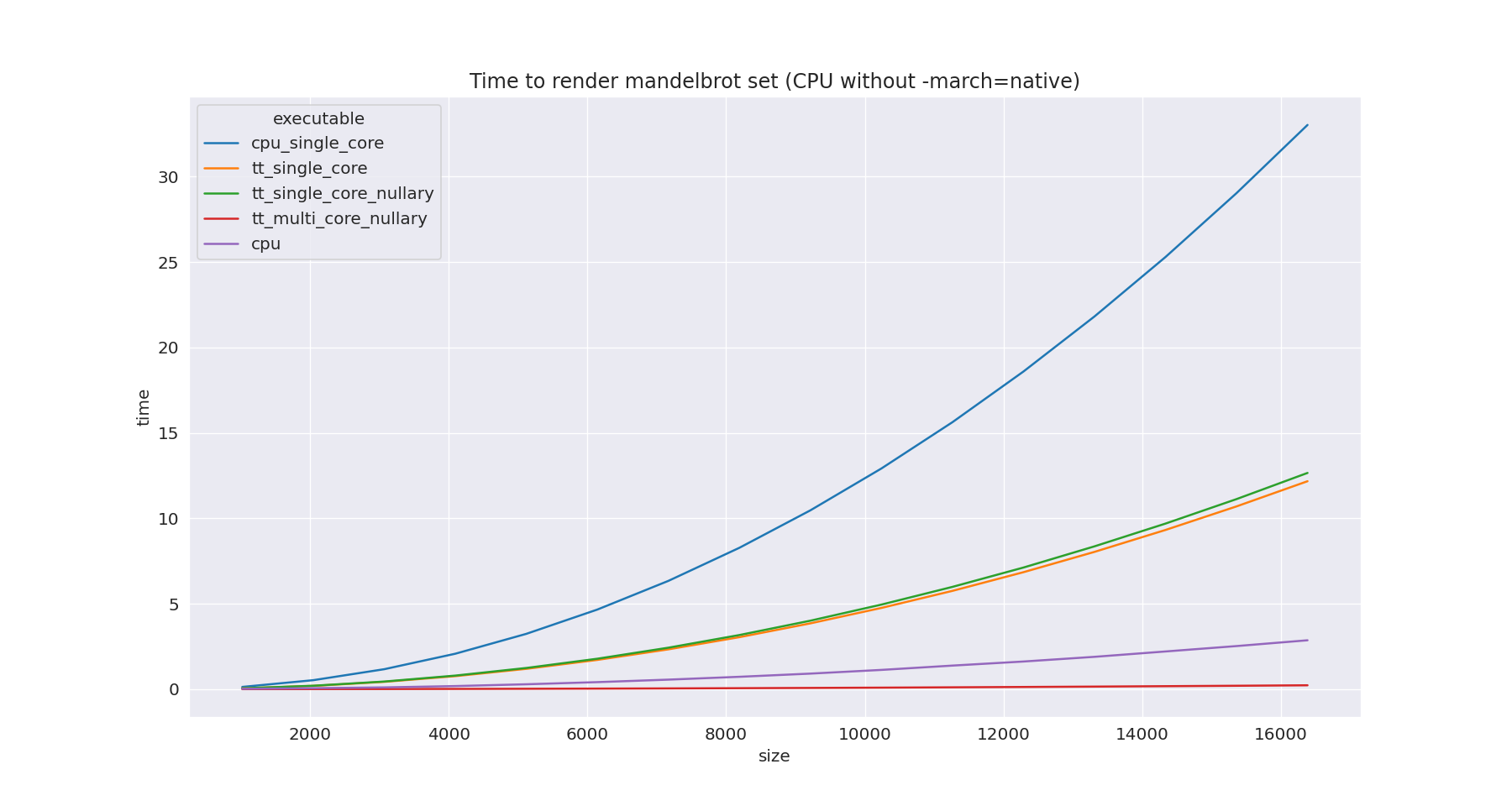 Compared to CPU without the`-march=native` flag, the multicore SFPU implementation is about 12.6x faster then CPU multicore. Now the CPU line is really flat.