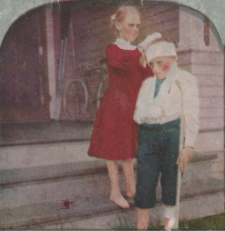 This is the same little boy who started out to make so much noise and smoke yesterday celebrating the Fourth. In the United States in one year, according to the figures gathered by experts, there were 168 boys and men and a few girls, too, who, like this boy, started out celebrate [sic], and wound up by leaving sorrowing friends, for that many were killed by explosions or died from lockjaw as the result of celebrating just one July 4th; and besides that, there were hundreds upon hundreds—something like 7,000 boys and men and girls maimed and crippled in that same celebration. Most of those who died were killed by lockjaw, one of the most terrible of diseases.