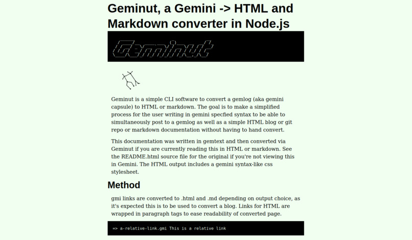This documentation was written in gemtext and then converted via Geminut if you are currently reading this in HTML or markdown. See the gemini README source file for the original if you're viewing this on the web or in markdown. The HTML output includes a gemini syntax-like css stylesheet.